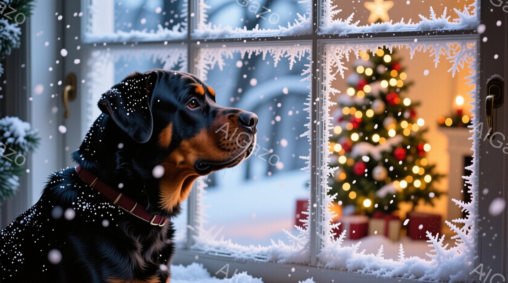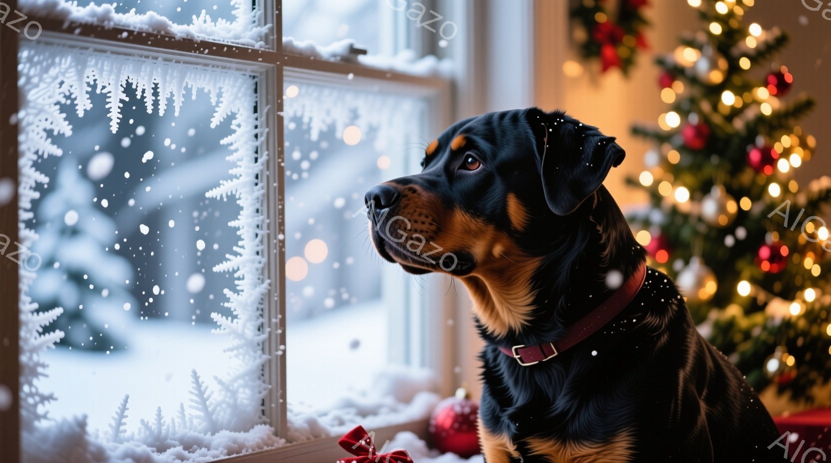 黒い毛並みで、首輪を付けたドーベルマンが窓の外を見つめている。背景にはぼやけたクリスマスツリーの光が輝き、窓には雪の結晶模様が描かれている。暖かく穏やかな、冬の日の静けさを感じる雰囲気だ。