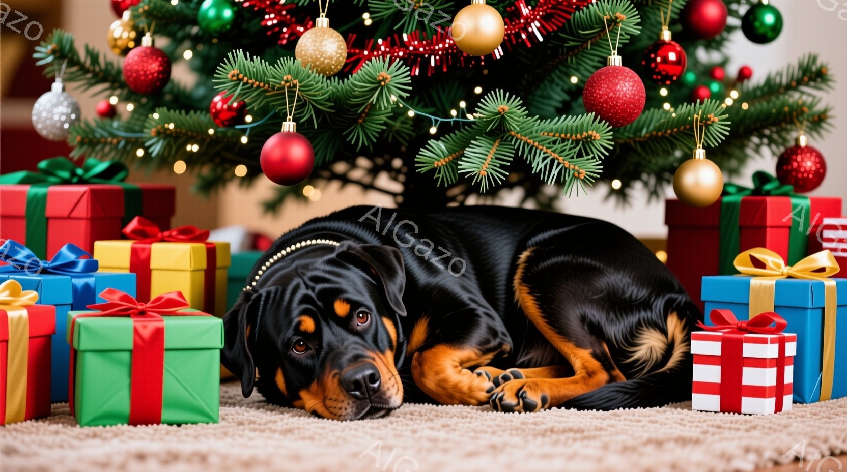 黒い毛並みのドーベルマンが、クリスマスツリーの下に置かれた様々な色のプレゼントの山に囲まれて横たわっています。犬は落ち着いた表情で、片方の前足を前に出し、リラックスした姿勢を見せています。背景には緑のクリスマスツリーが飾られ、暖かい光が全体を包み込み、穏やかで幸せなクリスマスの雰囲気を醸し出しています。