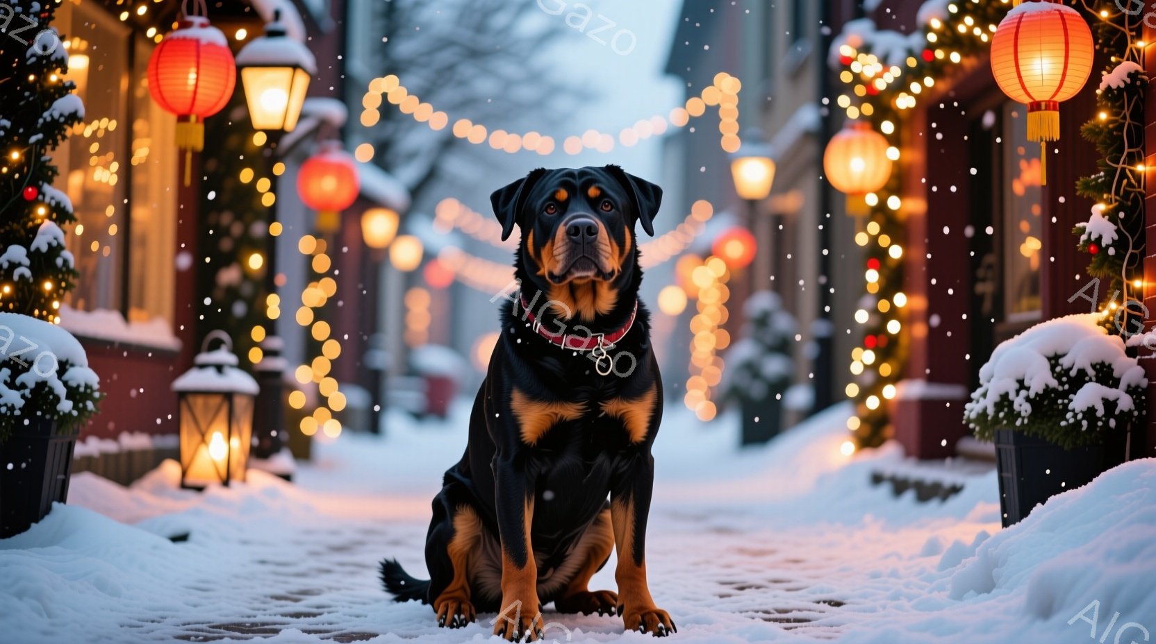 黒い毛並みのドーベルマンが雪に覆われた石畳の道に座っています。背景には、カラフルな電飾で飾られた建物が並び、冬の夜の暖かい雰囲気を醸し出しています。雪が舞い散る中で、堂々とした姿の犬が視線を捉え、静かで穏やかな冬の風景が広がっています。
