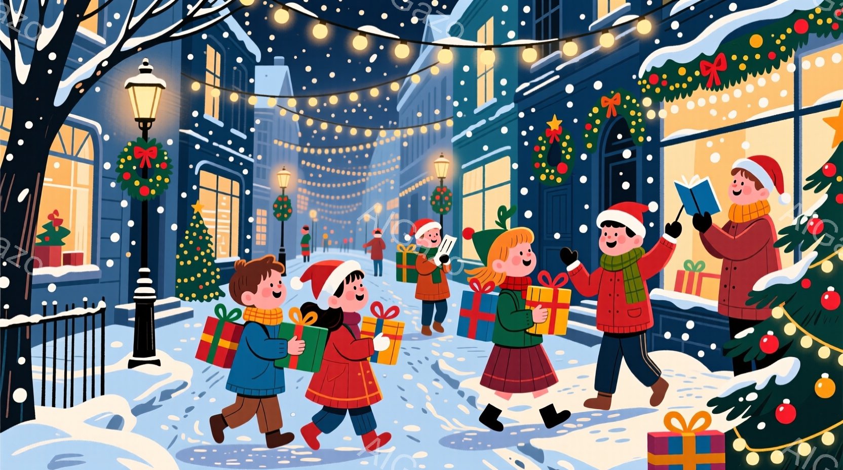 雪が降り積もる街並みを、プレゼントを手にした子供たちが楽しそうに歩いている様子が描かれている。子供たちは赤い帽子やマフラーを身に着け、明るい笑顔を浮かべている。背景には、クリスマスツリーや装飾が施された建物があり、暖かく華やかなクリスマスの雰囲気が漂っている。