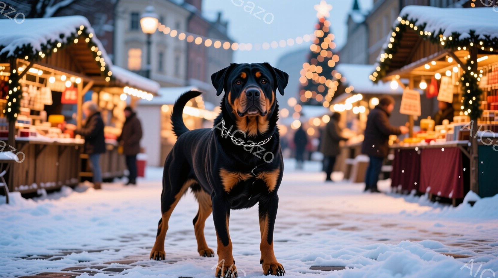 黒い毛並みに茶色の斑点が入った堂々としたドーベルマンが、雪に覆われた石畳の道に立っている。背景にはクリスマスマーケットのような賑やかな光景が広がり、多くの人々が冬の装いで歩き、屋台には色とりどりの商品が並んでいる。雪が舞い、暖かい光が灯ることで、祝祭的で幻想的な雰囲気が漂う。