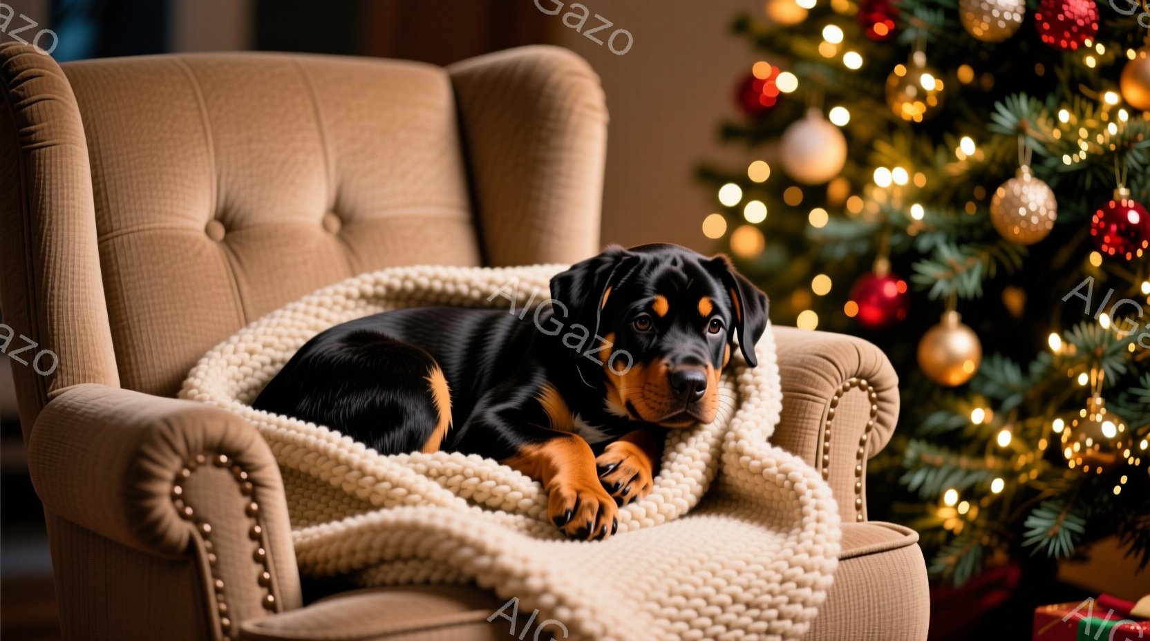 暖炉のそばの豪華なアームチェアに、黒とタンの毛並みを持つ愛らしい子犬が丸まって眠っています。クリーム色のふわふわのブランケットが子犬を優しく包み込んでおり、背景にはキラキラと輝くクリスマスツリーとプレゼントが飾られています。全体的に、暖かく、心地よく、お祝いの雰囲気です。