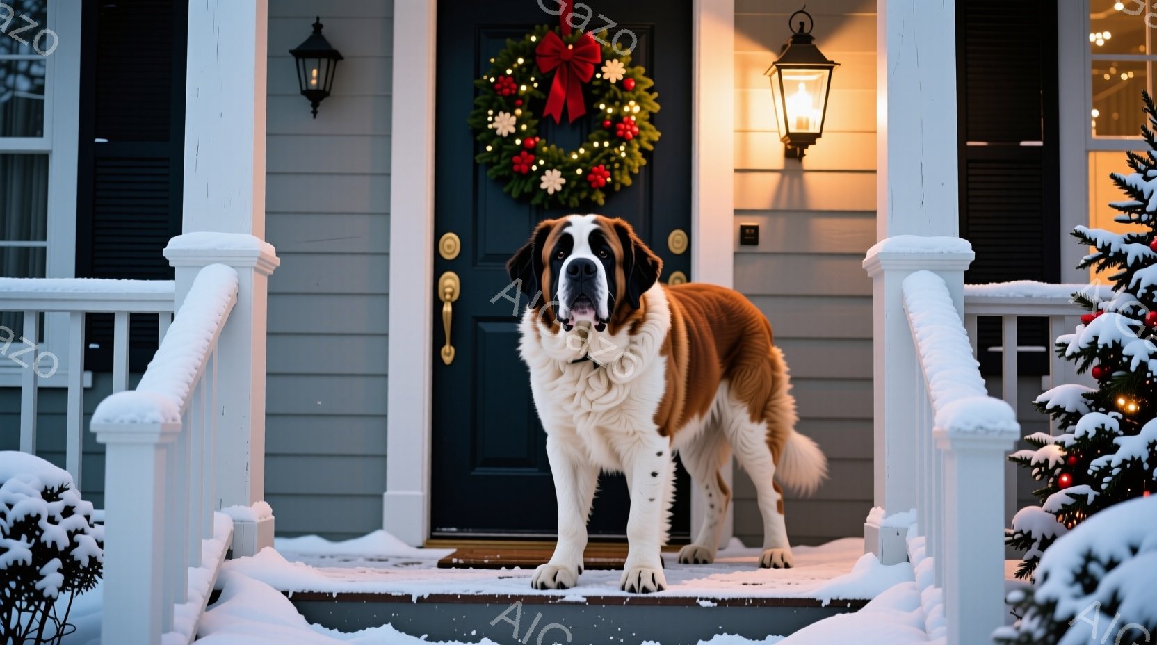 灰色の外観の家が雪に覆われたポーチに立つ、大きなセント・バーナード犬が写っています。犬は正面を向き、落ち着いた表情で立っており、白い雪が降り積もる冬の風景が広がっています。玄関には赤い実と緑の葉で飾られたクリスマスリースが飾られ、温かい光が窓から差し込み、穏やかで心地よい雰囲気を醸し出しています。