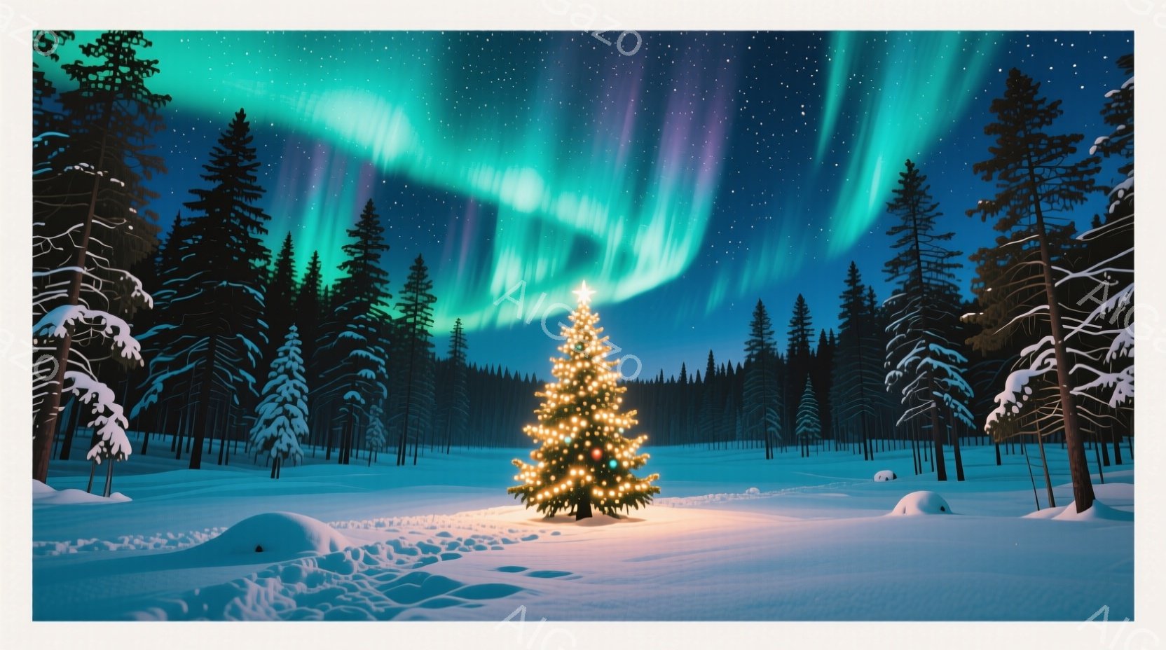 雪深い森林の中に、ライトアップされたクリスマスツリーが輝いている。オーロラが夜空を彩り、幻想的な雰囲気を醸し出している。雪原には足跡が点在し、静寂の中に生命の息吹を感じさせる。