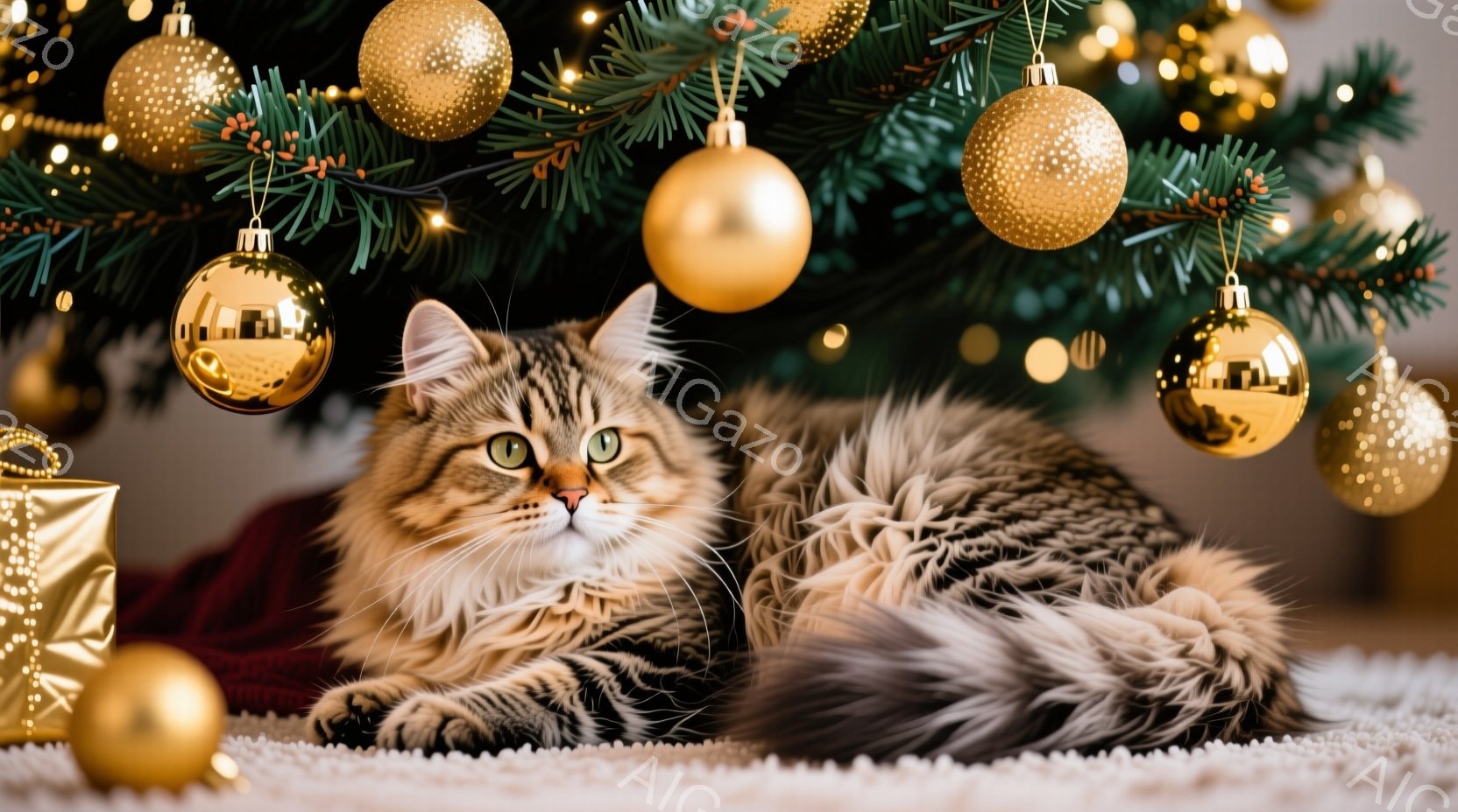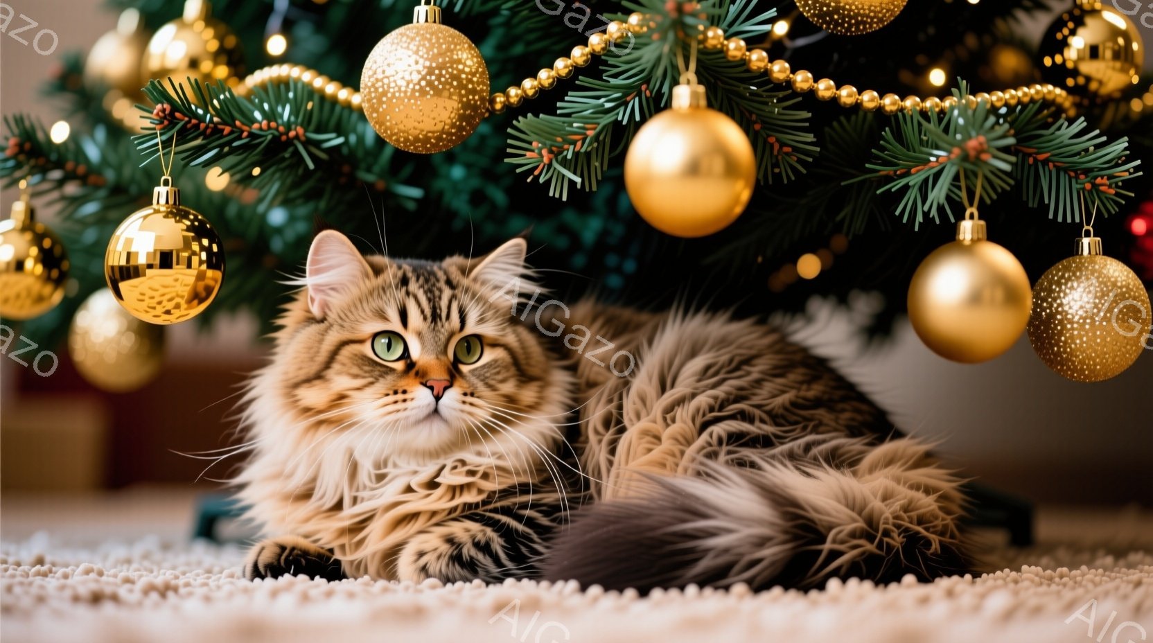 縞模様の大きな猫が、クリスマスツリーの下のカーペットの上に横たわっています。猫は落ち着いた表情でカメラの方を見ており、その毛並みはふさふさとしていて、光沢があります。背景には緑豊かなクリスマスツリーと、キラキラと光る装飾が散りばめられており、暖かい雰囲気を醸し出しています。
