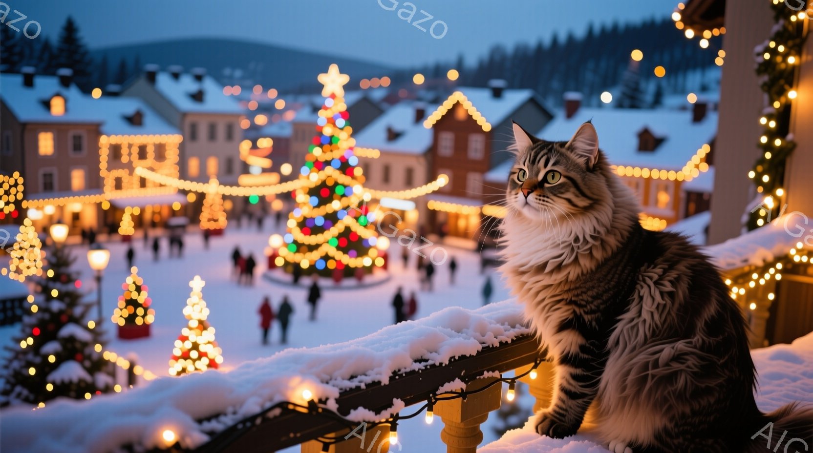 雪が降り積もった街並みを背景に、柵の上で座っている茶トラの猫が写っています。猫は正面を向いており、鋭い眼差しで何かを見つめているようです。背景にはクリスマスイルミネーションで飾られた建物や人々が見え、冬の暖かく幻想的な雰囲気が漂っています。