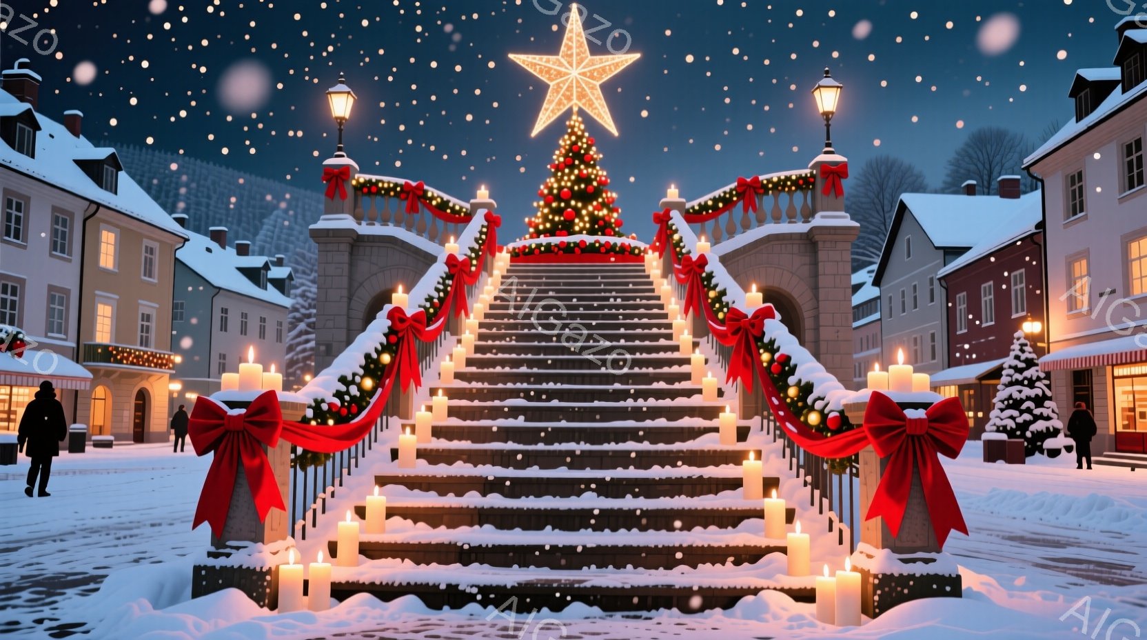 雪が舞う夜の美しい光景で、階段がキャンドルと赤いリボンで飾られ、クリスマスの装飾が施されたクリスマスツリーが頂上に輝いている。背景には、冬の装いの建物が並び、遠くには雪に覆われた木々が見える、穏やかで静謐な雰囲気である。数少ない人々は暗い服装で、遠くから景色を眺めているようだ。