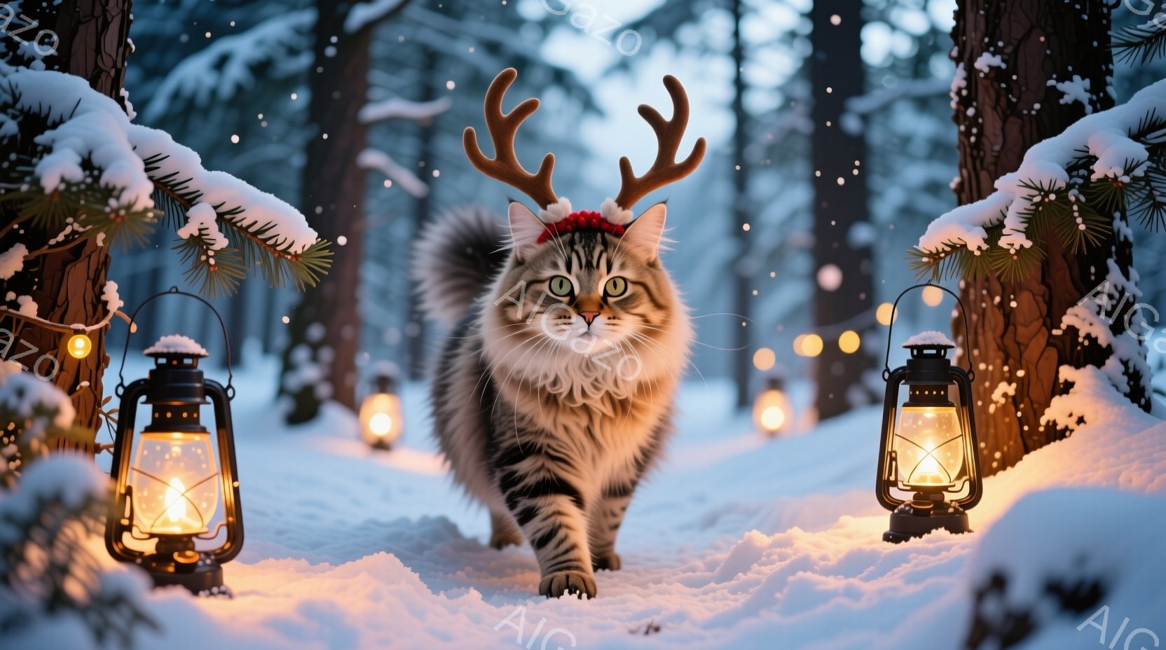 白い雪の上に、角と緑色の首輪をつけた縞模様の猫がこちらに向かって歩いてくる。背景には、雪で覆われた木々と、ぼんやりと光るランタンが並び、冬の幻想的な雰囲気を醸し出している。猫は自信に満ちた表情で、まるで冬の森の王様のように見える。