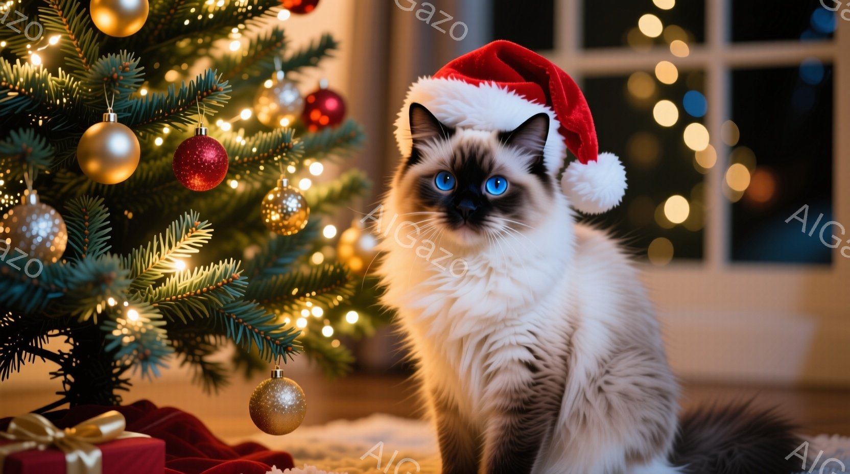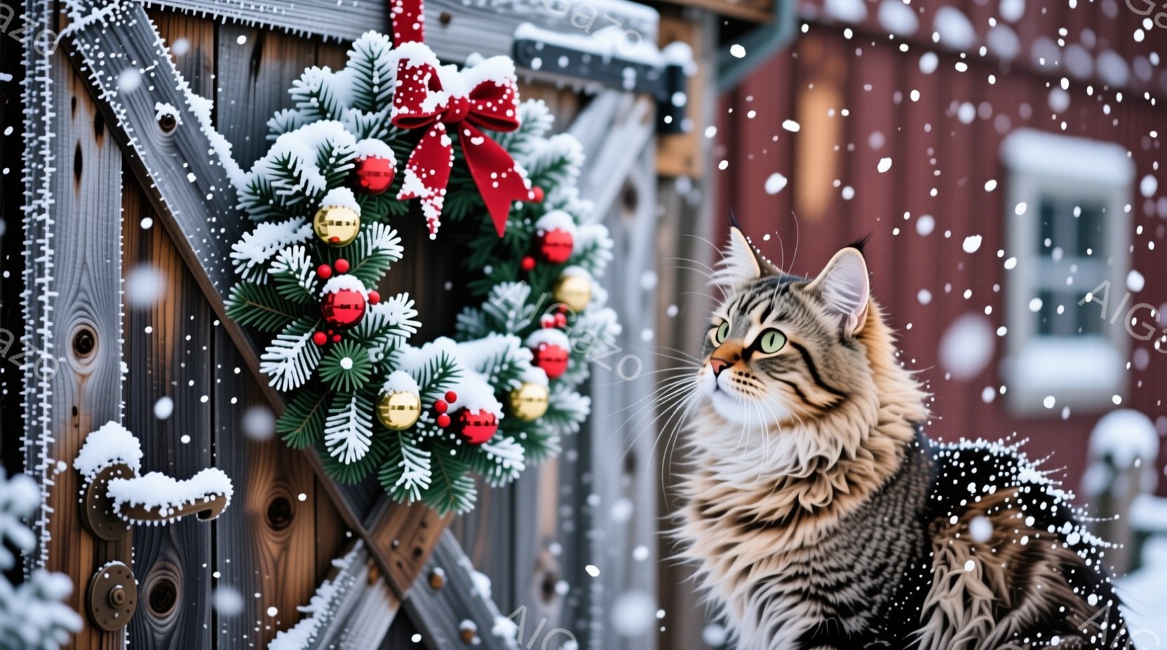 この無料AI生成画像「クリーム色の毛並みを持つ美しい猫が、雪に覆われた木製のドアに取り付けられたクリスマスリースを見上げています。背景は雪が降り積もり、冬の静寂と温かさを感じさせる光景です。猫の青い瞳と、リースに施された赤いリボンと金色のオーナメントが、季節の喜びを表現しています。」は、2025年10月24日に作成されました。 サイズは 1664×928px の高解像度で、商用利用も可能なフリー素材として提供しています。