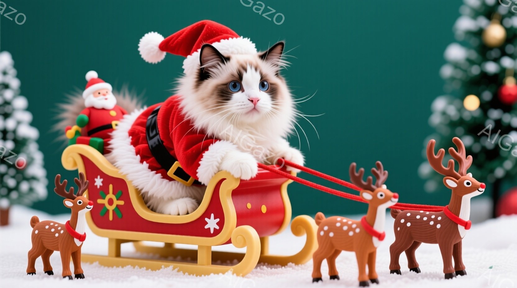 白と茶色の美しい猫が、赤いサンタの衣装を着てソリに乗っています。ソリは金色の装飾が施され、小さな星が散りばめられています。背景には緑色のクリスマスツリーとプレゼントがあり、雪が降る冬の暖かくお祝いの雰囲気を作り出しています。