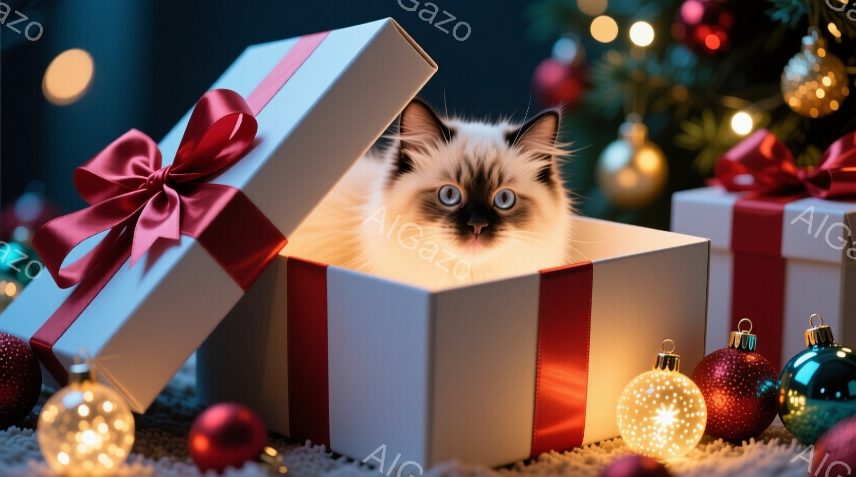 白いギフトボックスの中に、美しいシャム猫が丸まって座っています。猫は青い目を持ち、少し好奇心とリラックスした表情をしています。背景にはクリスマスツリーのぼんやりとした光と、明るく光るオーナメントが散りばめられており、温かくお祝いムードに満ちた雰囲気です。
