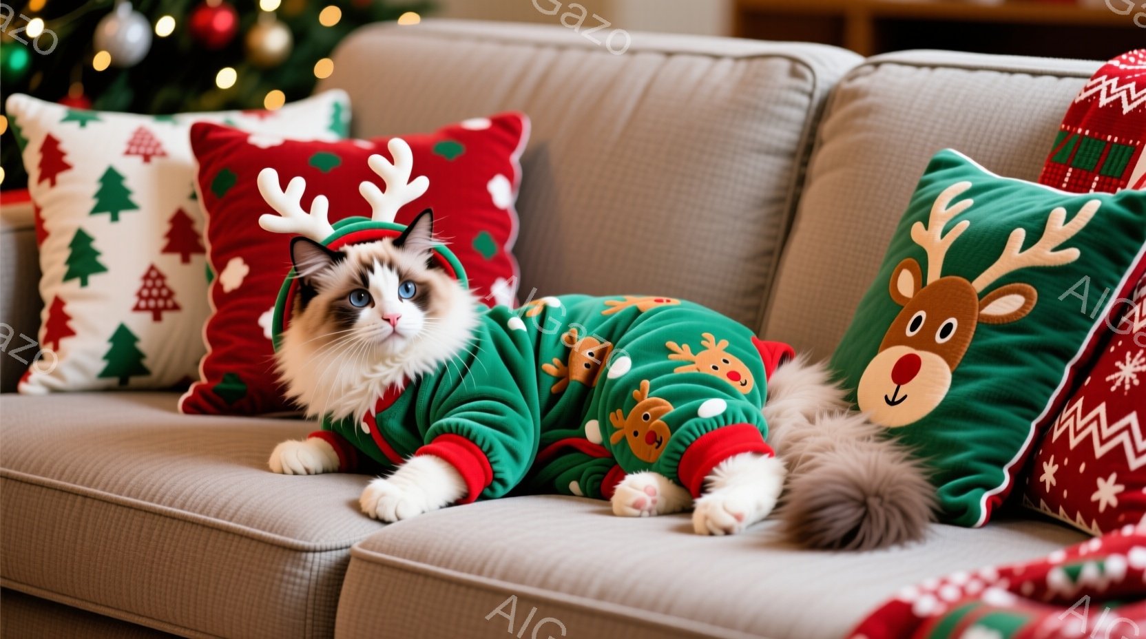 ふわふわのラグドール猫が2匹、クリスマスの柄のクッションに寄り添ってリラックスしています。どちらも赤い襟と角がついた白いセーターを着ており、穏やかで満足そうな表情をしています。背景にはぼやけたクリスマスツリーが見え、暖かく居心地の良い雰囲気が漂っています。