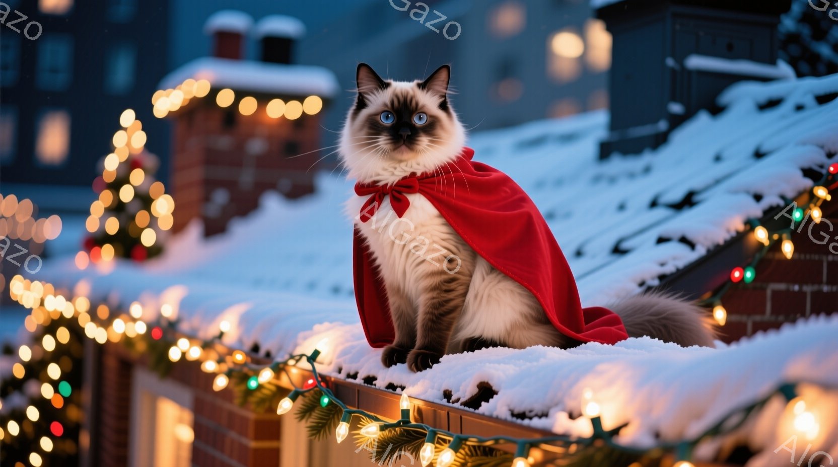 白とクリーム色の毛並みを持つ猫が、赤いマントを羽織って雪に覆われた屋根の上で座っています。背景には、キラキラと輝くクリスマスライトと、雪化粧した建物が見え、まるで冬の夜の物語のような幻想的な雰囲気です。猫は前方をまっすぐ見つめ、穏やかで自信に満ちた表情をしています。