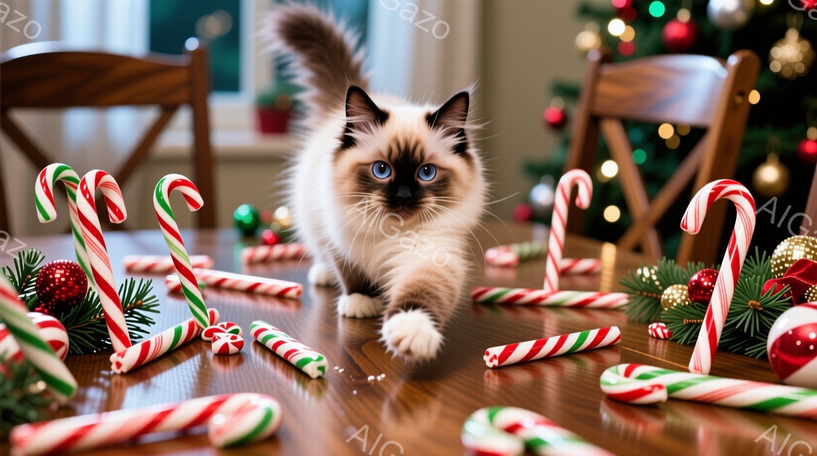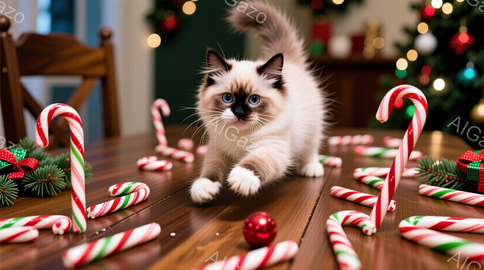 暖炉のある木製のテーブルの上に、ペパーミントキャンディやオーナメントが散らばっています。クリーム色の毛並みで青い目をした子猫が、テーブルの上をよちよちと歩きながら、興味深そうに何かを見つめています。背景にはクリスマスツリーが飾られ、暖かくお祝いムードに満ちた室内空間が広がっています。