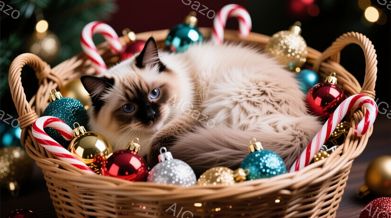 シベリアンハスキーのような毛並みの猫が、飾り付けられたクリスマスオーナメントでいっぱいのバスケットに丸まって眠っています。猫は青い目をしており、リラックスした表情で、背景にはぼやけたクリスマスツリーのイルミネーションが見えます。全体的に、温かく、お祝いムードに満ちた、冬の雰囲気が漂う写真です。