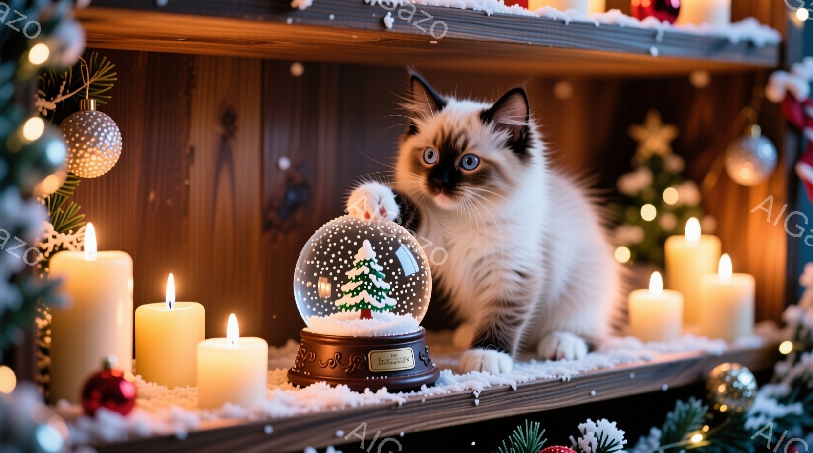 白いラグドール猫が、クリスマスツリーが入った雪の玉を前足で触ろうとしている姿が捉えられています。背景には、クリスマスツリーの飾り、白いキャンドル、そして雪が散りばめられた棚が見え、暖かく幻想的な雰囲気を醸し出しています。猫の好奇心旺盛な表情と、クリスマスの装飾が相まって、冬の温かさと喜びを感じさせる一枚です。