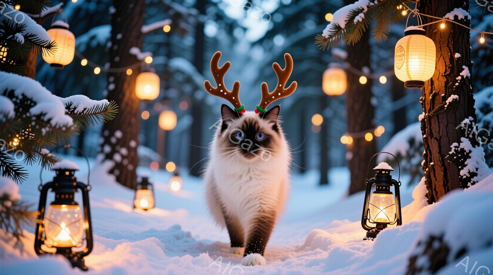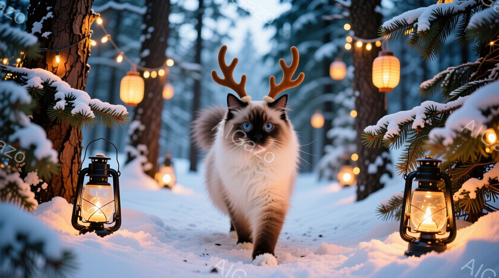 白い毛並みの美しい猫が、角のような飾りを頭に乗せて雪の中を歩いている。背景には、点灯したランタンや輝く光が散りばめられ、クリスマスのような幻想的な雰囲気を醸し出している。雪景色と暖かな光のコントラストが、温かく穏やかな冬の情景を描き出している。