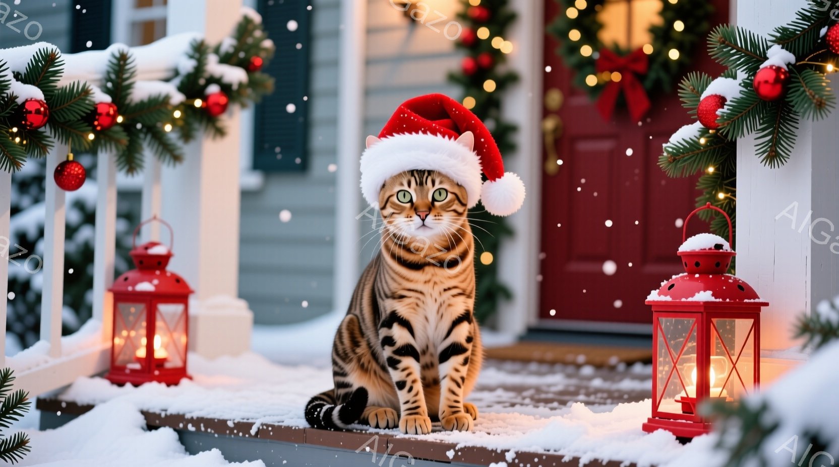 茶色のトラ柄の猫が、赤いサンタの帽子を被って、雪の積もった家の外の階段に座っています。背景には、クリスマス飾りのついた玄関ドアと、赤い提灯と装飾が施された植物が見え、雪が静かに降っています。全体的に、温かく、お祝いムード溢れる冬の光景です。