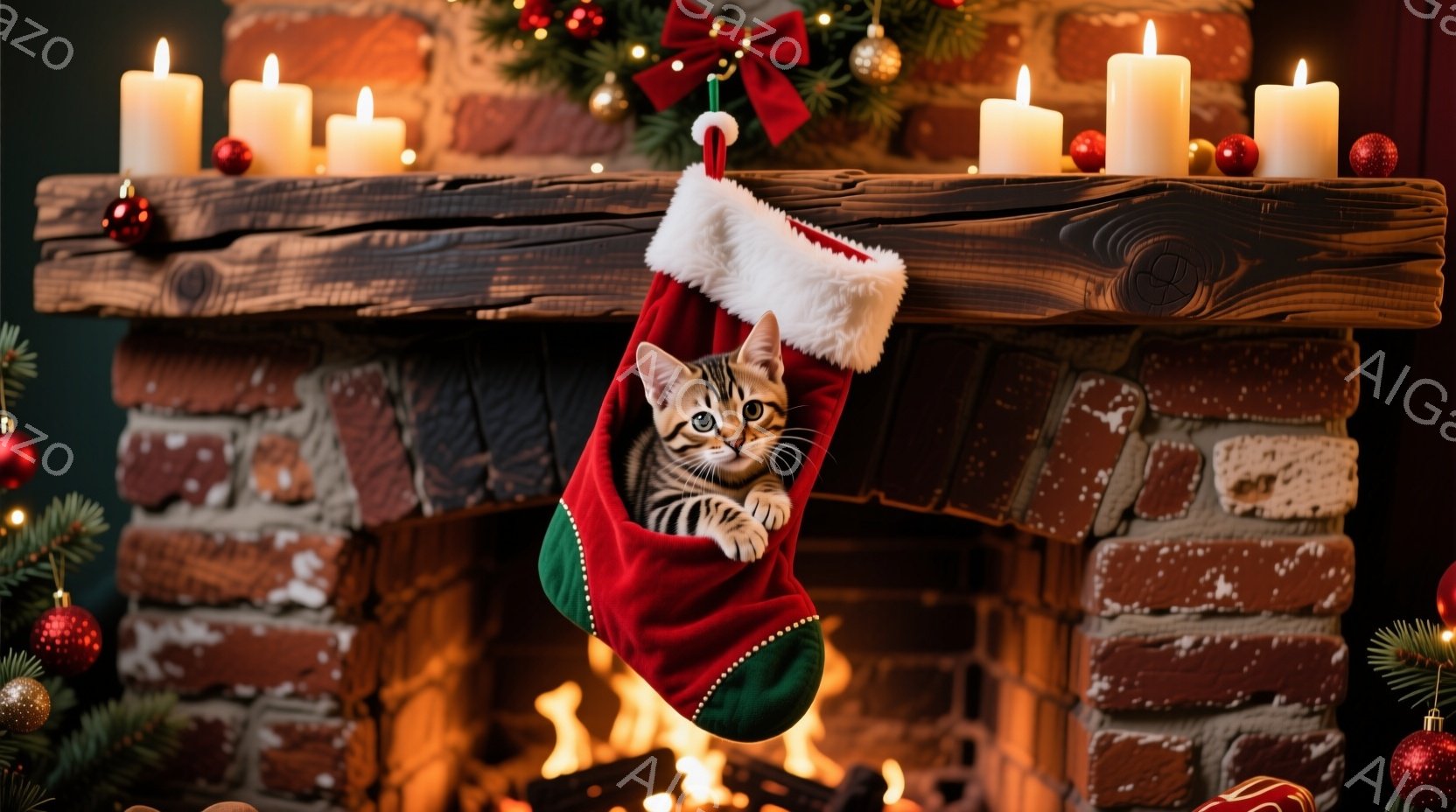 赤いクリスマスストッキングの中に、縞模様の小さな子猫が丸まって座っています。暖炉の赤いレンガの壁と、緑のクリスマスツリーの飾り、そして点灯しているキャンドルが背景にあり、クリスマスの温かく心地よい雰囲気を醸し出しています。暖炉の火の光が子猫と背景を柔らかく照らし、ほっこりとした光景を作り出しています。