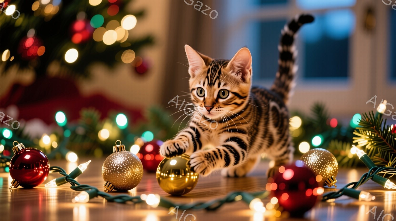 縞模様の小さな子猫が、クリスマスツリーのオーナメント(赤い、銀色、金色のボール)の間で遊び、前足でボールを軽く叩いています。背景にはぼやけたクリスマスツリーと、温かく輝く電飾があり、室内は穏やかで楽しい雰囲気に包まれています。子猫は好奇心旺盛な表情で、遊んでいる様子から喜びが伝わってきます。
