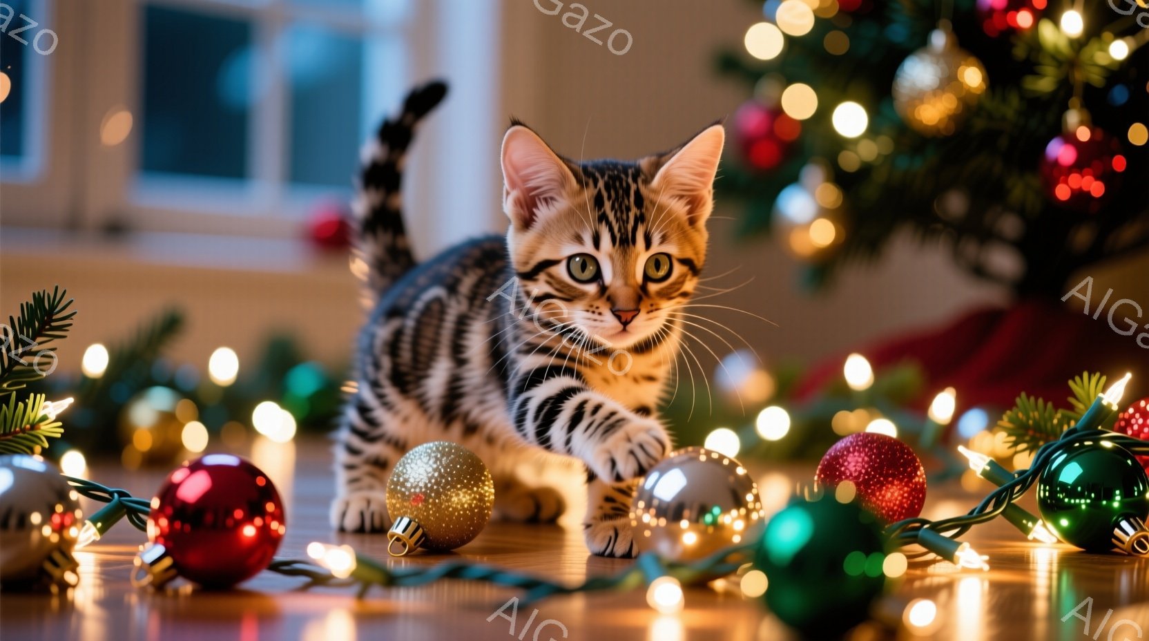 縞模様の小さな子猫が、クリスマスオーナメントと電飾の間を駆け抜けている。背景にはぼやけた緑のクリスマスツリーと、暖色系の光が散りばめられた室内が広がっており、華やかで遊び心のある雰囲気を醸し出している。子猫の表情は遊び心に満ちており、その姿は可愛らしいクリスマスの光景をさらに引き立てている。