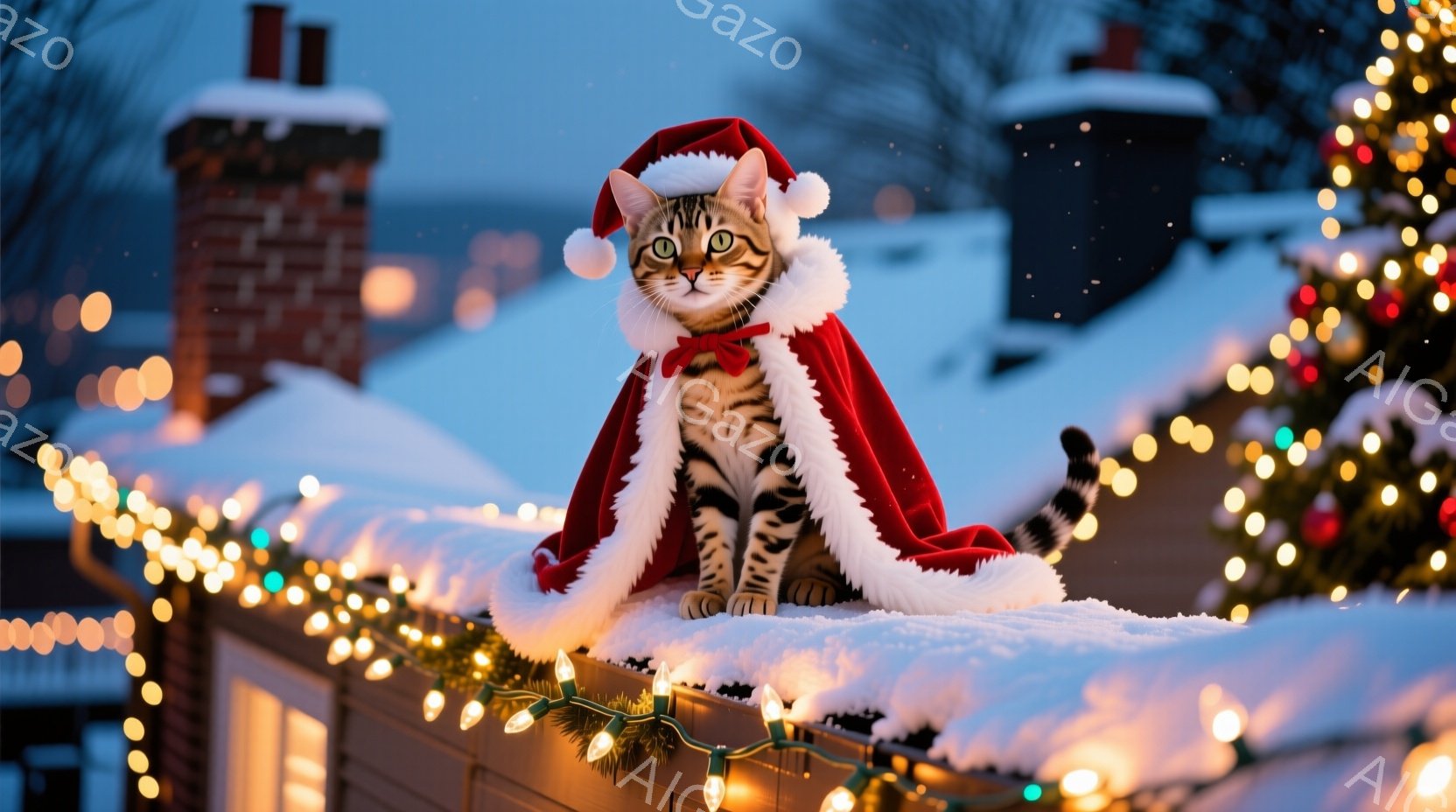 屋根の上には、サンタの帽子と赤いマントを身につけた縞模様の猫が座っています。猫は前をまっすぐ見ており、少しいたずらっぽい表情を浮かべています。背景には、きらめくイルミネーションと雪に覆われた建物があり、冬の暖かいお祭り気分を醸し出しています。