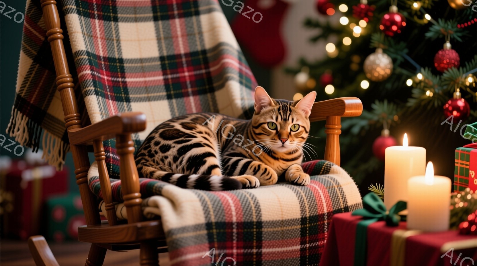 茶色と黒の縞模様の猫が、赤いチェック柄のブランケットが掛けられた木製のロッキングチェアにゆったりと横たわっています。背景には、キラキラと光るクリスマスツリーと、点灯したキャンドル、プレゼントが置かれており、暖かく穏やかなクリスマスの雰囲気が漂っています。猫はリラックスした表情で、まるでクリスマスの静けさを楽しんでいるようです。