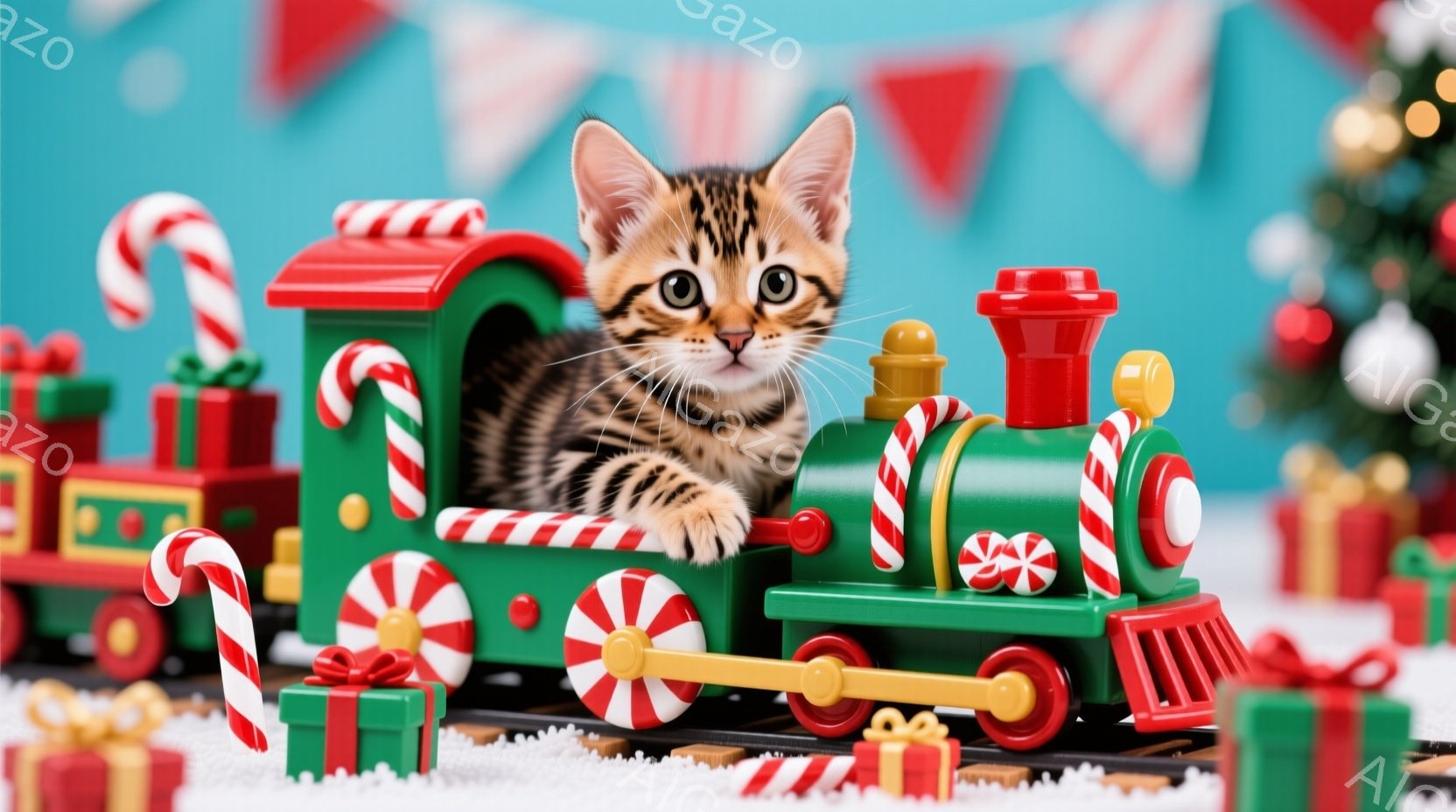 明るいクリスマス背景に、ロッキングチェアに横たわる縞模様の猫が写っています。猫はリラックスした表情でカメラを見つめており、椅子のクッションにはチェック柄のブランケットが掛けられています。背景にはクリスマスツリーやプレゼントボックスが配置され、温かく穏やかなホリデーの雰囲気を醸し出しています。