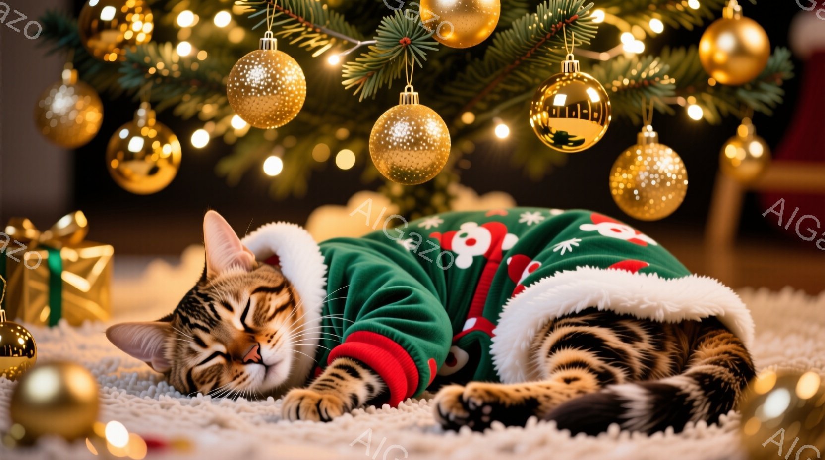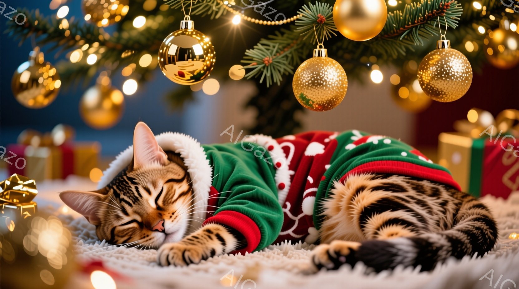 茶色と黒の斑点模様の猫が、赤いクリスマス柄のベッドリネンの上に丸まって横たわっています。猫は前足を揃え、落ち着いた表情でカメラの方を見ています。背景にはぼやけたクリスマスツリーと、暖かい光を放つ電飾が見え、クリスマスの温かく心地よい雰囲気が漂っています。