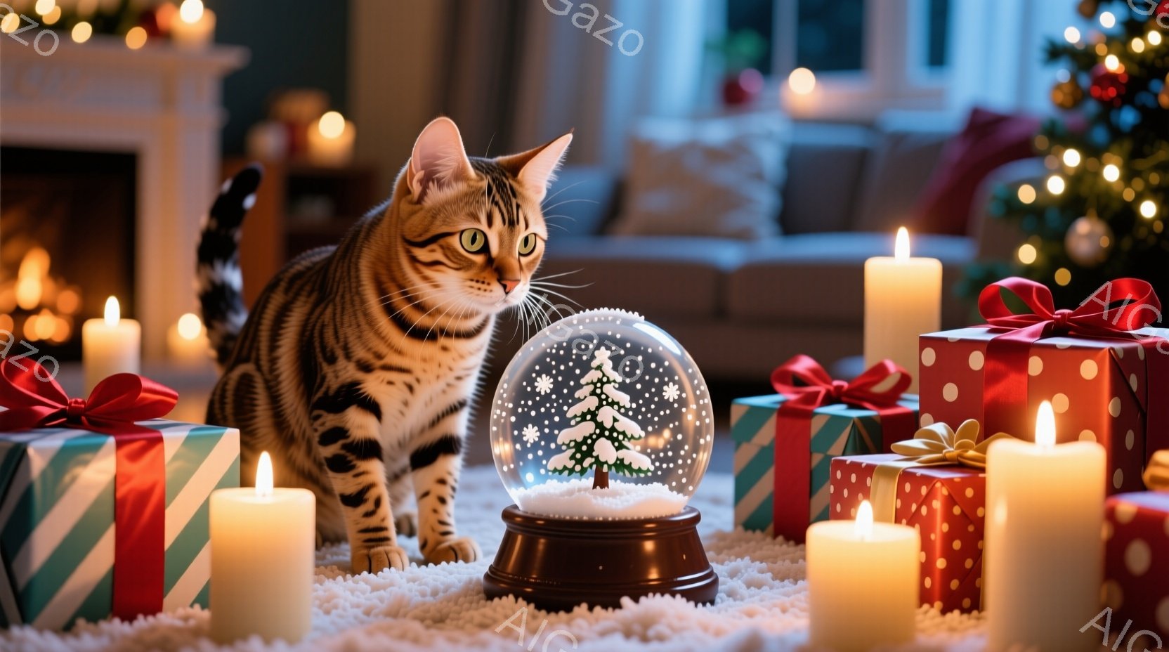 2匹のベンガルの猫が、雪の結晶が舞うスノーグローブの周りに座っています。背景には、クリスマスツリー、プレゼント、点灯されたキャンドルが配置され、暖かく、お祝いの雰囲気を醸し出しています。猫たちは前方を注視し、興味津々とした表情を浮かべています。