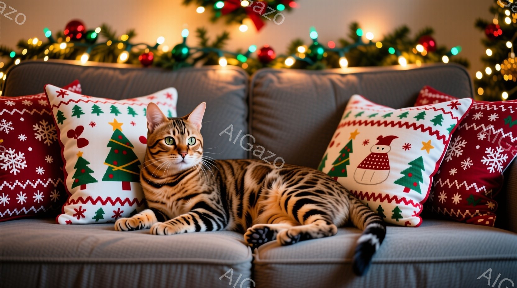 ソファの上で、縞模様の茶色の猫がリラックスして横たわっています。猫は前足を伸ばし、落ち着いた表情でカメラを見つめています。背景にはクリスマスツリーと飾り付けがあり、赤いクリスマス柄のクッションに囲まれており、温かく居心地の良い雰囲気が漂っています。