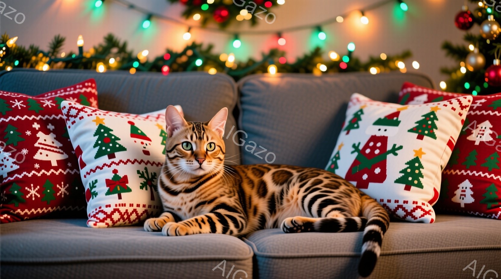 ソファに横たわる、美しい模様のベンガル猫が中央にいます。猫はリラックスした様子で、青い目をカメラに向けています。背景にはクリスマスツリーの飾り付けと、クリスマスを象徴するクッションが並び、温かくお祝いムードにあふれています。