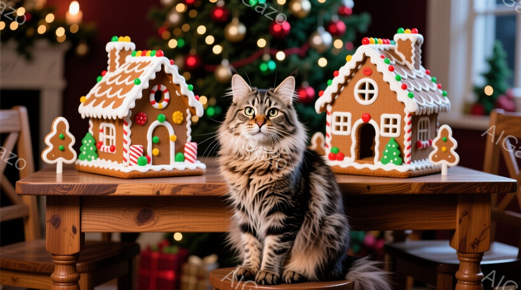 長毛の茶トラ猫が椅子に座り、正面を見つめています。猫の周りにはクリスマスの装飾が施されており、テーブルの上にはジンジャーブレッドハウスと小さなクリスマスツリーが置かれています。背景にはぼやけたクリスマスツリーの光がちらつき、暖かくお祝いムードを醸し出しています。