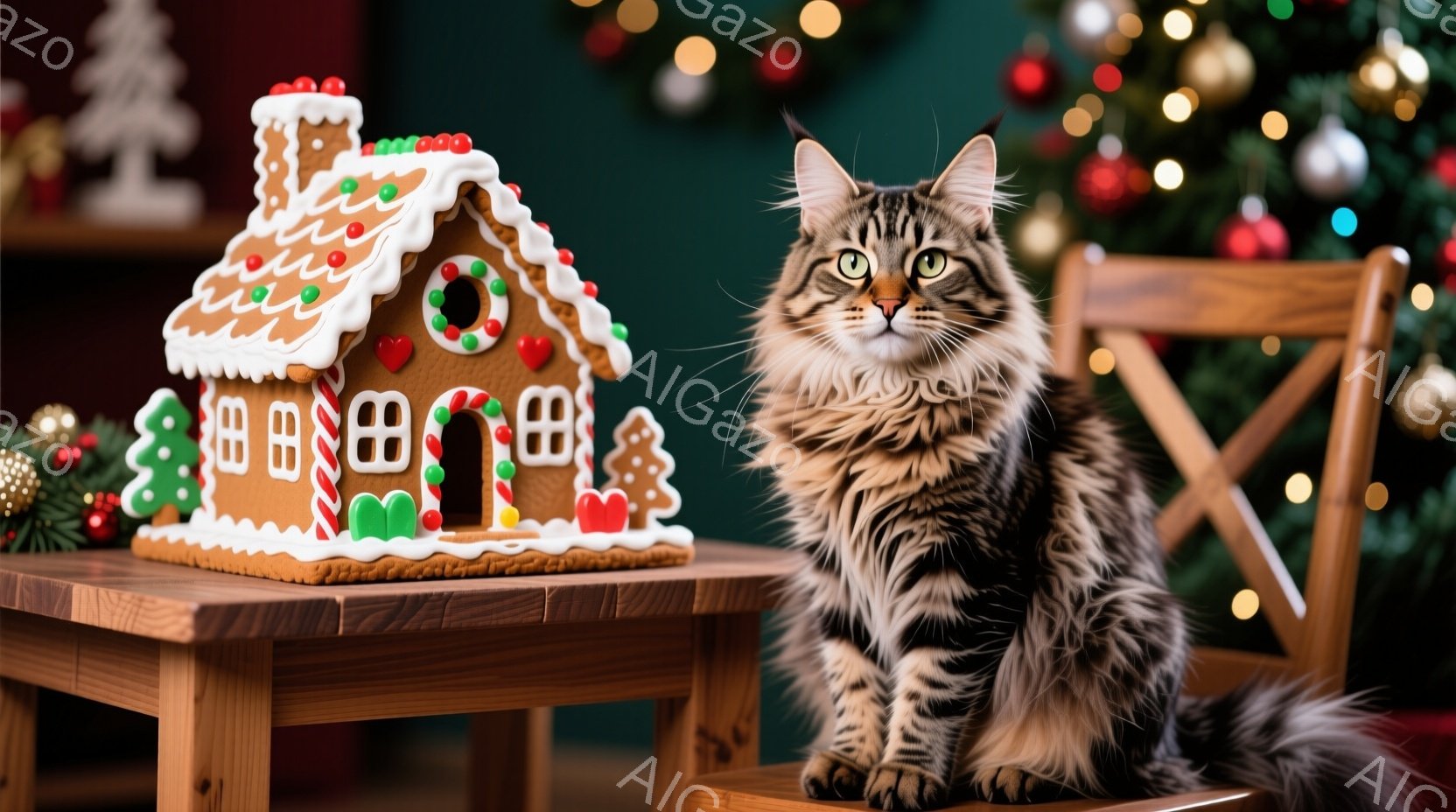 長毛の縞模様の猫が木製の椅子に座り、カメラを見つめている。背景には、クリスマスツリーやジンジャーブレッドハウスのオーナメントが配置され、暖かく、お祝いの雰囲気を醸し出している。猫の毛並みはふさふさとしており、表情は穏やかで、リラックスした様子が伺える。