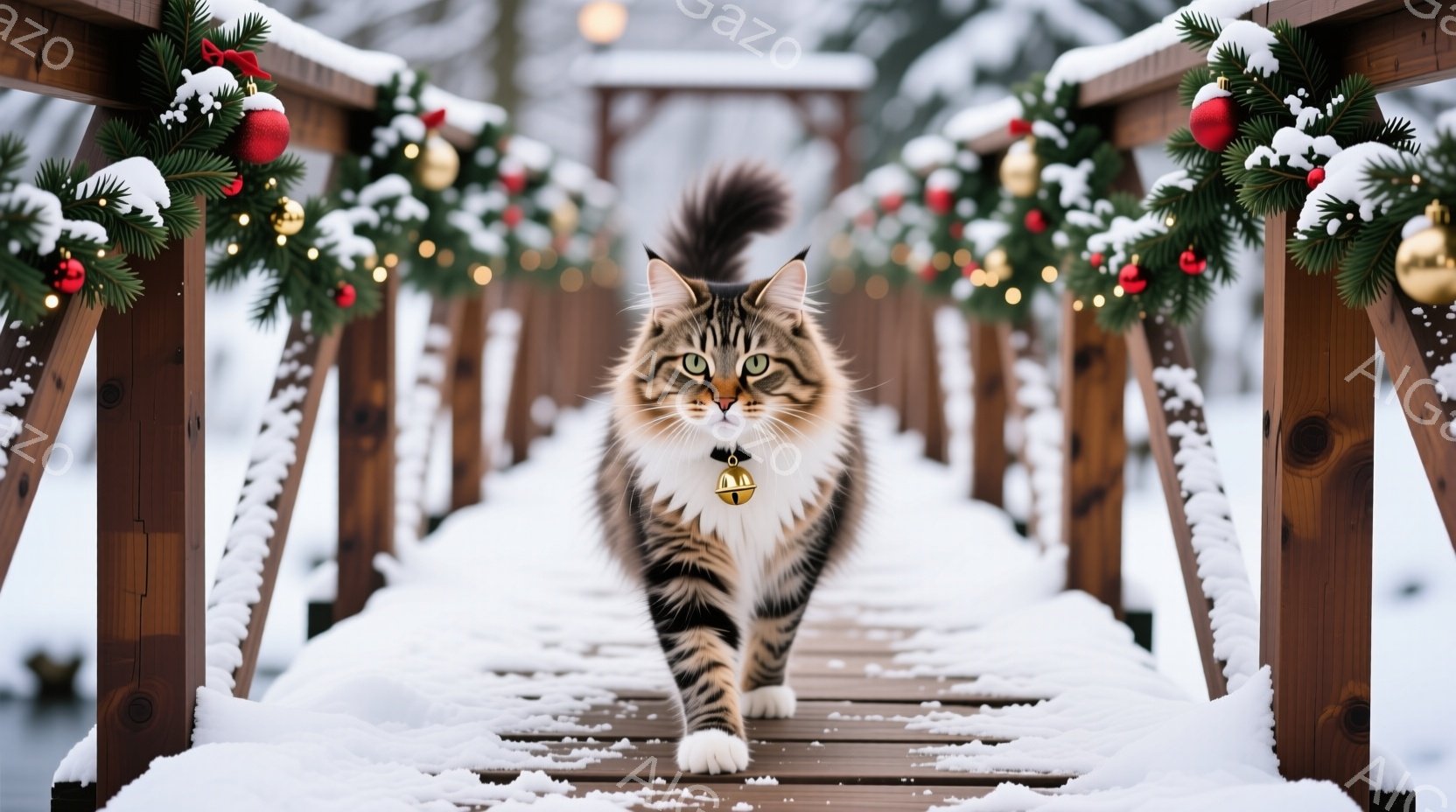 白い雪に覆われた木製の橋を、縞模様の猫が堂々と歩いている。猫は赤い首輪と金のベルを身につけ、自信に満ちた表情で正面を見据えている。背景には、クリスマスの飾りで彩られた橋の側面が続き、冬の穏やかで華やかな雰囲気を醸し出している。