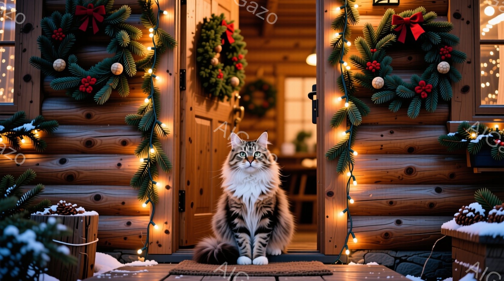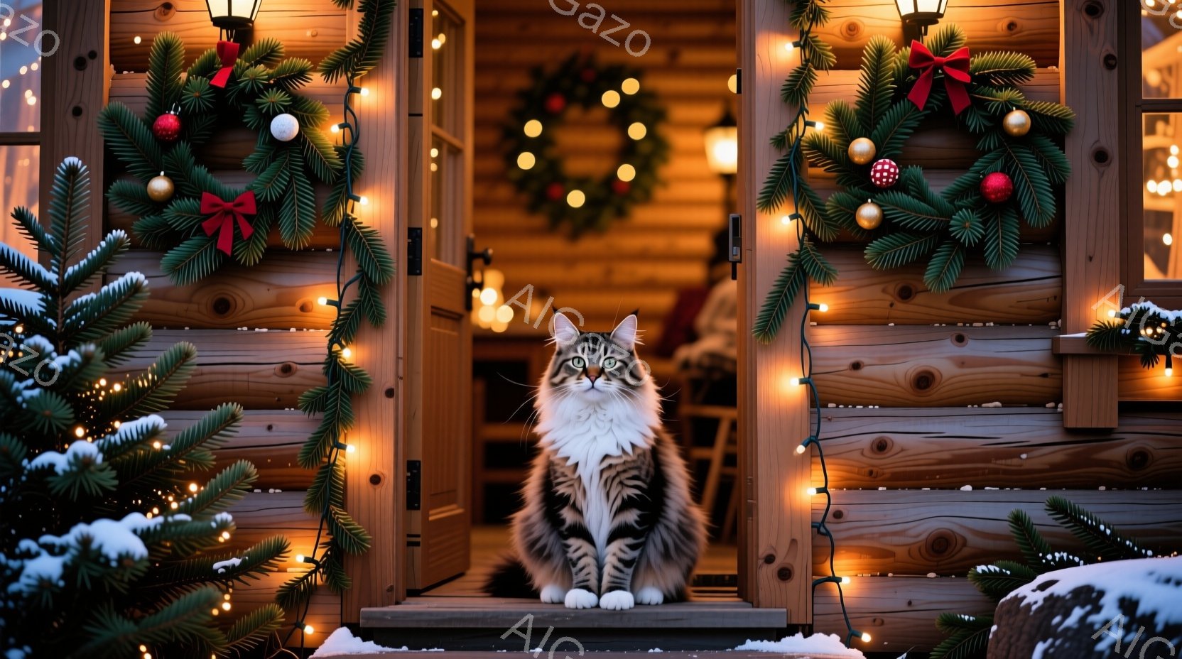 長毛の灰色と白い猫が、クリスマスの飾り付けがされた家の入り口でまっすぐ座って正面を見ています。背景には、クリスマスリース、電飾、木製の構造が映り、温かくお祝いムードの空間を表現しています。雪が少し積もり、冬の穏やかな雰囲気が漂っています。