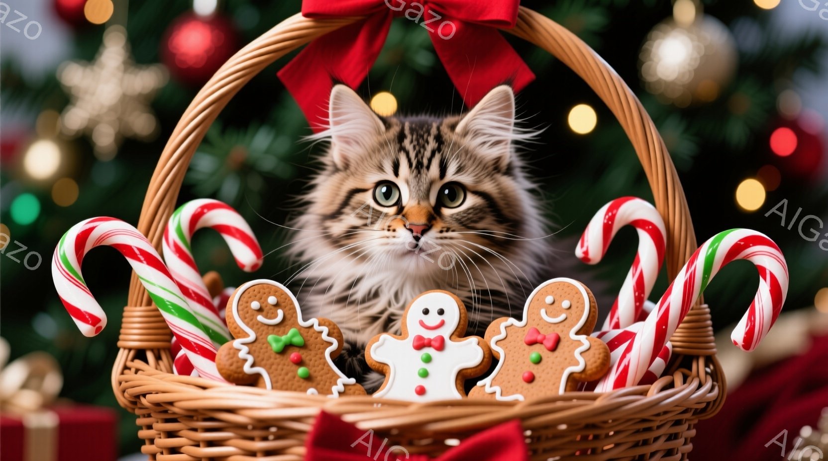 あたたかい色合いのバスケットの中に、ふわふわの茶色の縞模様の猫が座っています。周りには、キャンディケーンやジンジャーブレッドマンのクッキーが置かれ、背景にはクリスマスツリーのぼやけた光が輝いています。全体的に、暖かく、お祝いの雰囲気で、冬のホリデーシーズンを表現しています。