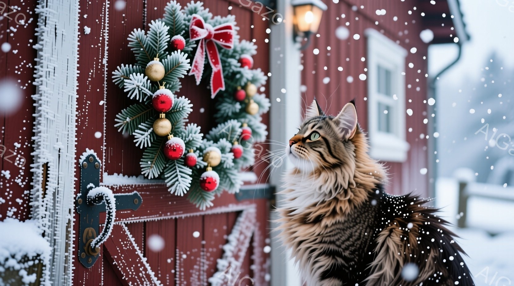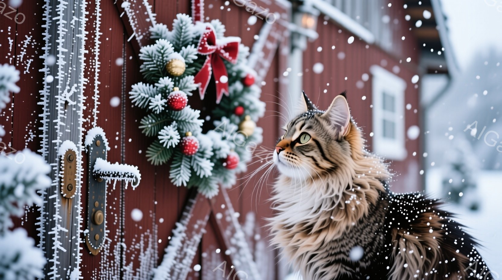 長毛の茶トラ猫が赤い木の壁に寄りかかり、何かを見上げています。背景にはクリスマスリースが飾られ、雪が降る冬の風景が広がっています。全体的に暖かく、穏やかなクリスマスの雰囲気が漂っています。