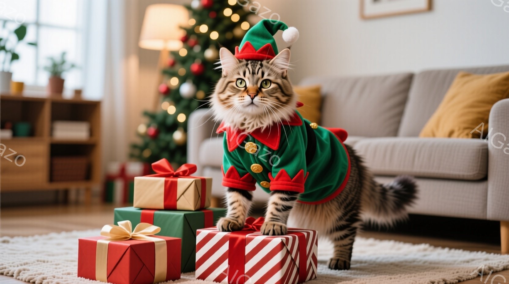 灰色の縞模様の猫が、クリスマスのエルフの衣装を着て、プレゼントボックスの上に立っています。猫は少し上目遣いで、おとなしい表情をしています。背景には、クリスマスツリー、ソファ、本棚が見え、暖かく居心地の良い雰囲気です。