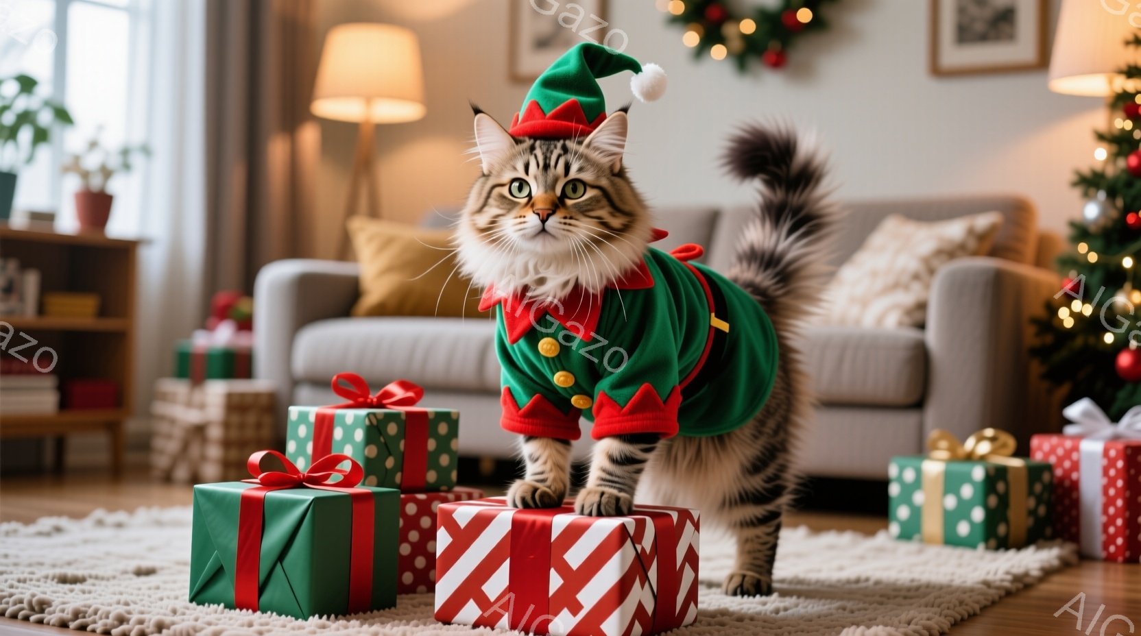 この無料AI生成画像「縞模様の猫が揺り椅子に丸まって座っており、リラックスした表情をしています。椅子の背もたれにはオフホワイトの編み物カバーがかけられ、背景にはクリスマスツリーとプレゼントが飾られています。暖色系の照明が全体を包み込み、温かく居心地の良い雰囲気を醸し出しています。」は、2025年10月24日に作成されました。 サイズは 1664×928px の高解像度で、商用利用も可能なフリー素材として提供しています。