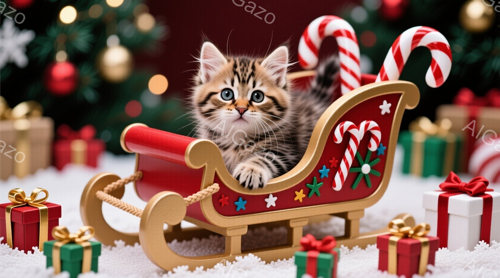 白と茶色の縞模様の小さな子猫が、赤いそりに座ってこちらを見ています。そりは木製で、キャンディケーンやクリスマスオーナメントで飾られ、周囲には緑と赤のリボンで結ばれたプレゼントが散らばっています。背景は緑のクリスマスツリーで、全体的に温かく、お祝いの雰囲気が漂っています。