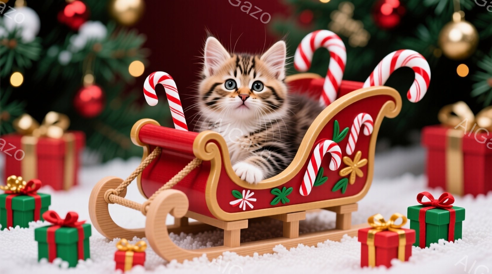 小さな縞模様の子猫が、クリスマスを象徴する赤いソリに座っています。ソリはキャンディケーンや緑の葉で飾られ、周囲には赤いリボンと緑色の包装紙で包まれた小さなプレゼントが散らばっています。背景にはぼやけたクリスマスツリーが見え、雪が降っている様子から冬の温かく可愛らしい雰囲気が伝わってきます。