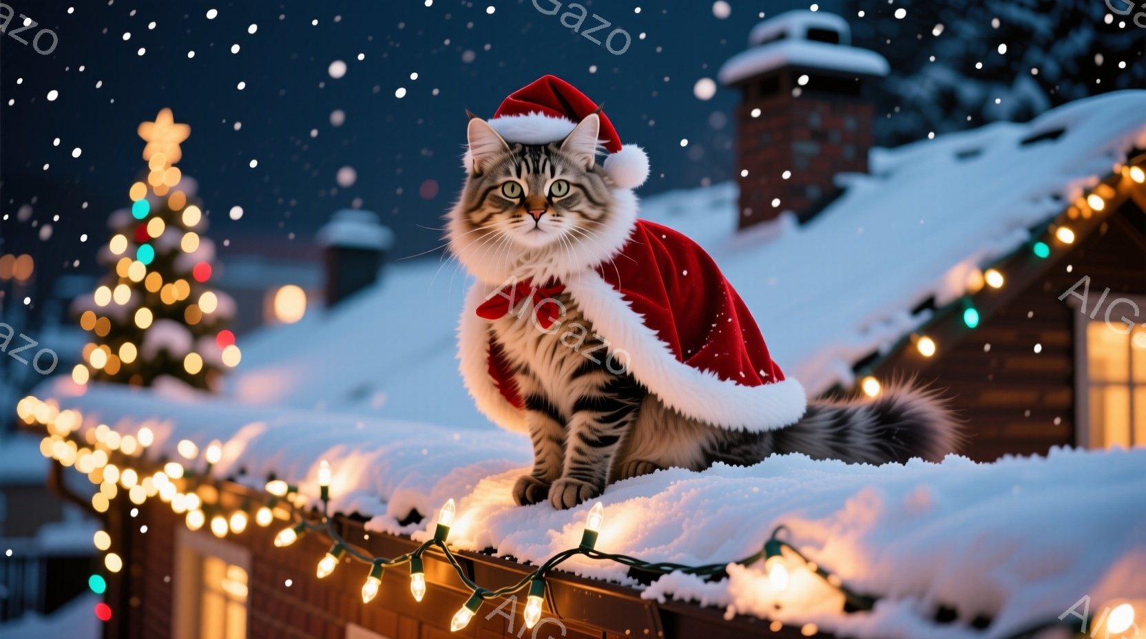 白い毛並みと灰色の縞模様の猫が、赤いサンタクロースの帽子と首輪をつけ、雪積もった屋根の上にとどまっています。背景には、点灯したクリスマスライトで飾られた家屋と、ぼんやりとした夕暮れの空が広がっています。全体的に、温かく、お祝いの、冬の雰囲気が漂います。