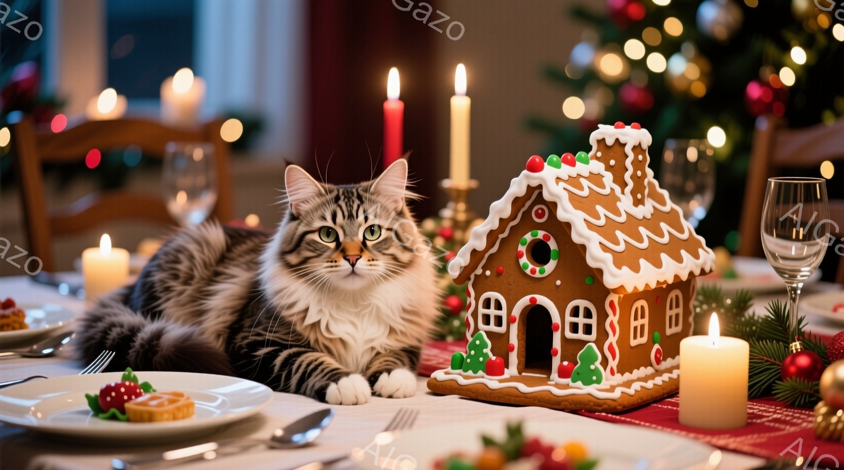 この無料AI生成画像「縞模様の猫がサンタクロースの帽子と赤いマントを身につけ、雪で覆われた屋根の上で優雅に座っています。背景には、クリスマスツリーや点灯した電飾が暖かく輝き、雪が降り積もる冬の夜の穏やかな雰囲気を醸し出しています。猫は前方をまっすぐ見つめ、どこか自信に満ちた表情を浮かべています。」は、2025年10月24日に作成されました。 サイズは 1664×928px の高解像度で、商用利用も可能なフリー素材として提供しています。
