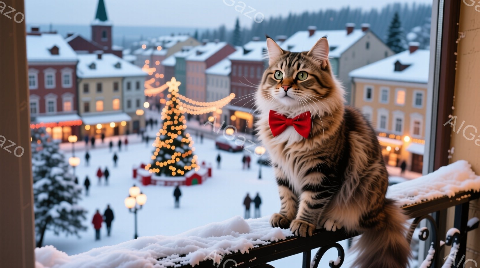 茶色と黒の縞模様の猫が、赤い蝶ネクタイをつけ、雪で覆われた手すりに座ってこちらを見ている。背景には、クリスマスツリーが輝き、雪景色の中にカラフルな建物が並んでいる賑やかな広場が広がり、冬の祭りの雰囲気を醸し出している。全体的に、暖かく、お祝いの気持ちに満ちた、魅力的な光景である。