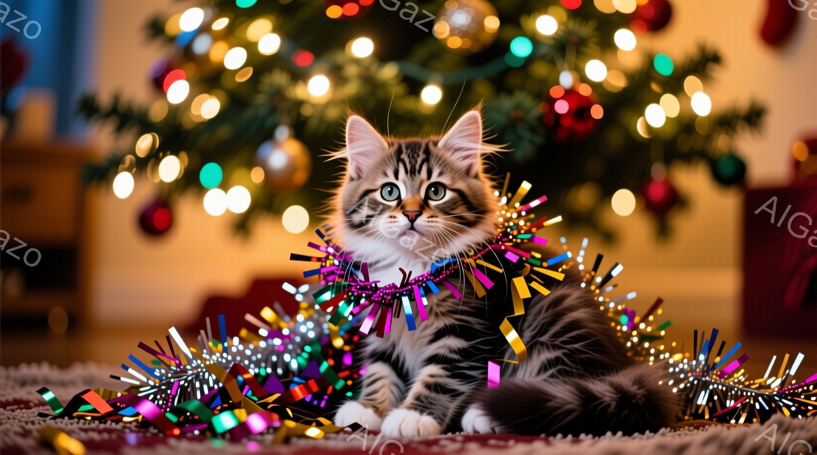 この無料AI生成画像「暖炉の前には赤いカーペットが敷かれ、プレゼントボックスと灯されたキャンドルが並んでいます。灰色の縞模様の猫がカーペットの上で横になり、リラックスした様子でカメラを見つめています。背景にはクリスマスツリーが飾られ、暖かく心地よい雰囲気を作り出しています。」は、2025年10月24日に作成されました。 サイズは 1664×928px の高解像度で、商用利用も可能なフリー素材として提供しています。