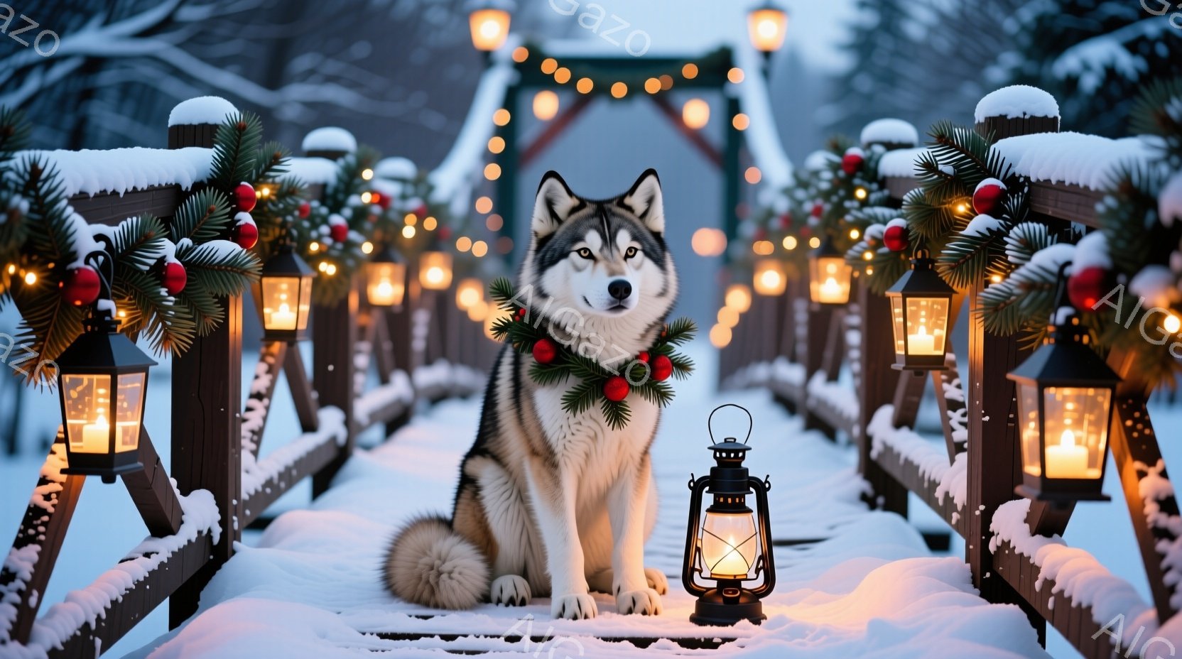 雪に覆われた木の橋の上で、美しいシベリアンハスキーが座っています。周囲には点灯したランタンが並び、クリスマスツリーの飾りが施され、冬の暖かい雰囲気を醸し出しています。背景は雪景色で、遠くには木々が見え、穏やかで幻想的な光景です。