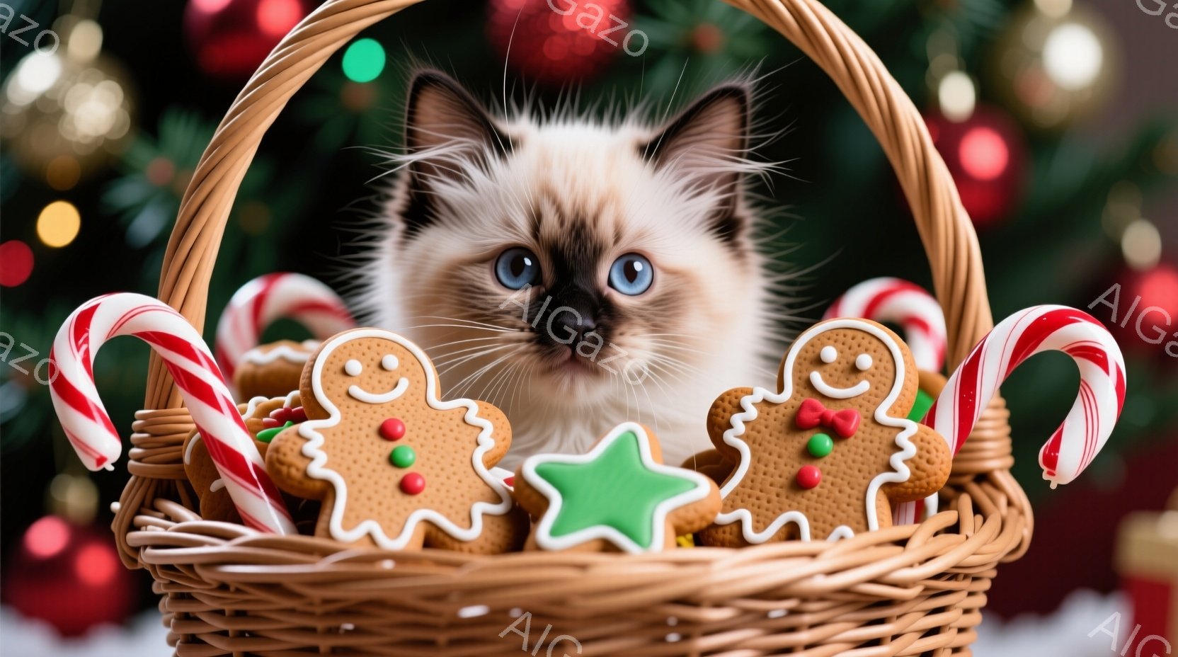 ふわふわとしたクリーム色の毛並みを持つ子猫が、クリスマスらしい籐製のカゴの中にいます。カゴの中には、ジンジャーブレッドマンやキャンディケーンが飾られており、暖かくお祝いの雰囲気が漂っています。背景にはぼやけたクリスマスツリーの光が散りばめられ、冬の праздничное настроение を高めています。