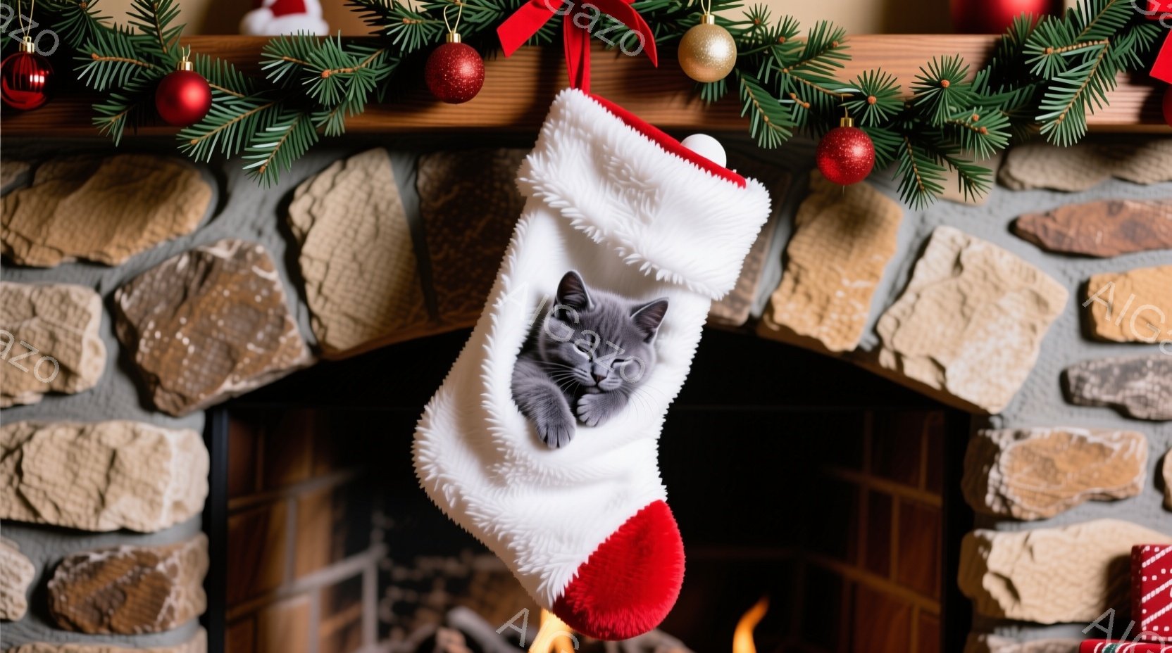 クリスマスソックスの中に灰色の小さな子猫が丸まって眠っています。暖炉のレンガの壁が背景にあり、クリスマスツリーの飾りがソックスの上部に飾られています。暖炉の炎が暖かく、居心地の良いクリスマスの雰囲気を醸し出しています。