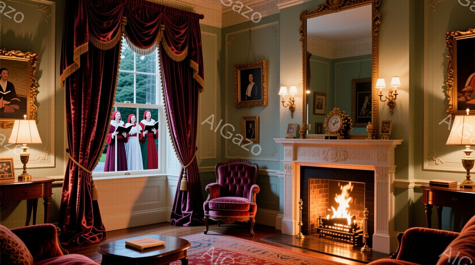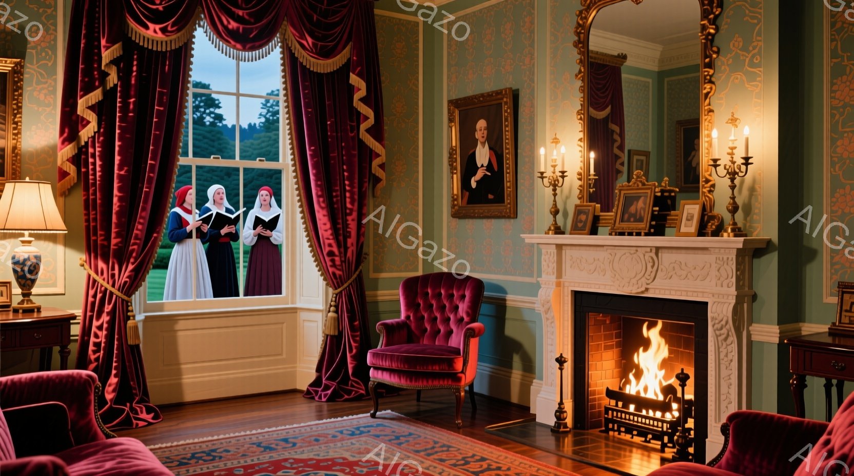 部屋は豪華な内装で、壁は緑色の壁紙、床は赤い模様のカーペットで覆われています。窓の外には、緑豊かな風景が広がり、数人の女性が白い衣装を着て、楽しそうに何かを歌っているようです。暖炉には火が灯り、部屋全体が温かく、居心地の良い雰囲気で満たされています。